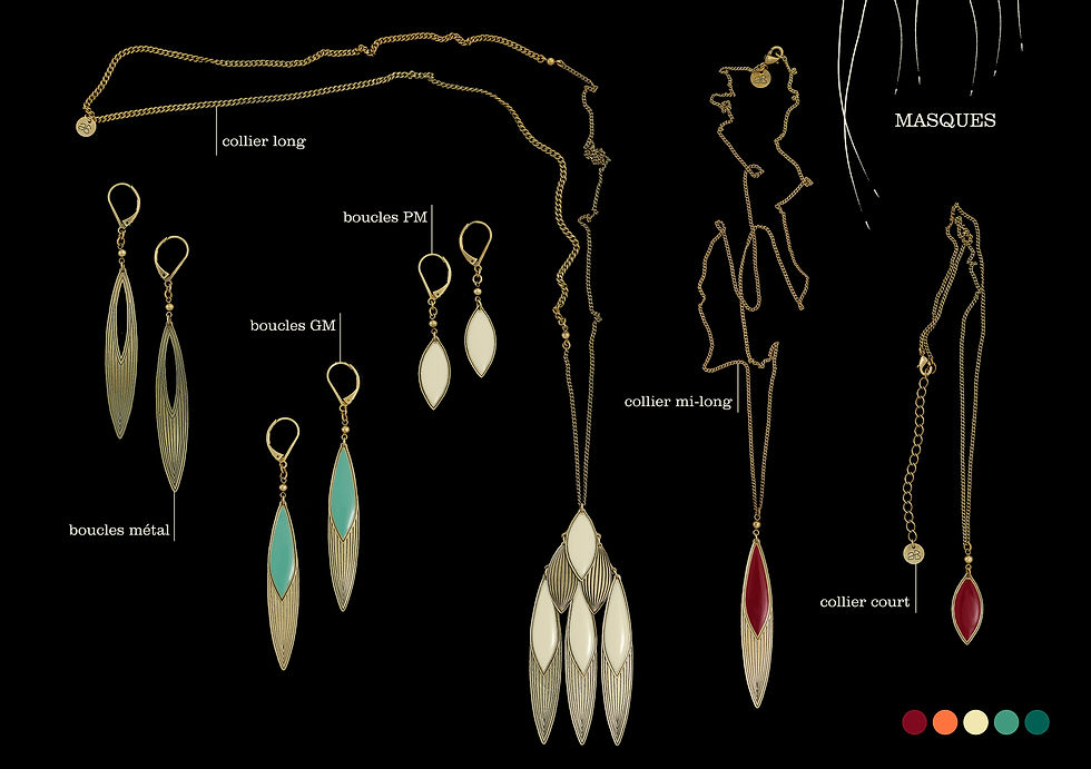 Les bijoux avec résine sont disponibles dans une gamme de 5 couleurs emblématiques de la marque : rouge bordeaux, corail, nacré, vert céladon et bleu paon.